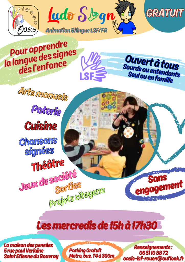Tous les mercredis de période scolaire, une/des activités sont organisés en bilinguisme LSF/FR dans le but que chacun puisse apprendre du vocabulaire par le jeu. L’enfant peut venir seul, en fratrie, avec un adulte (sous réserve de place disponible)